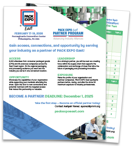 The PACK EXPO East Partner Program is designed as a strategic promotional partnership, helping build connections and packaging and processing advancement within the industry, along with supporting your members and advancing your cause. Partners help us bring together a greater variety of professionals to enrich the exchange of ideas, connections, and industry-driving collaboration that take place at the show. The deadline to join is Monday, December 1.